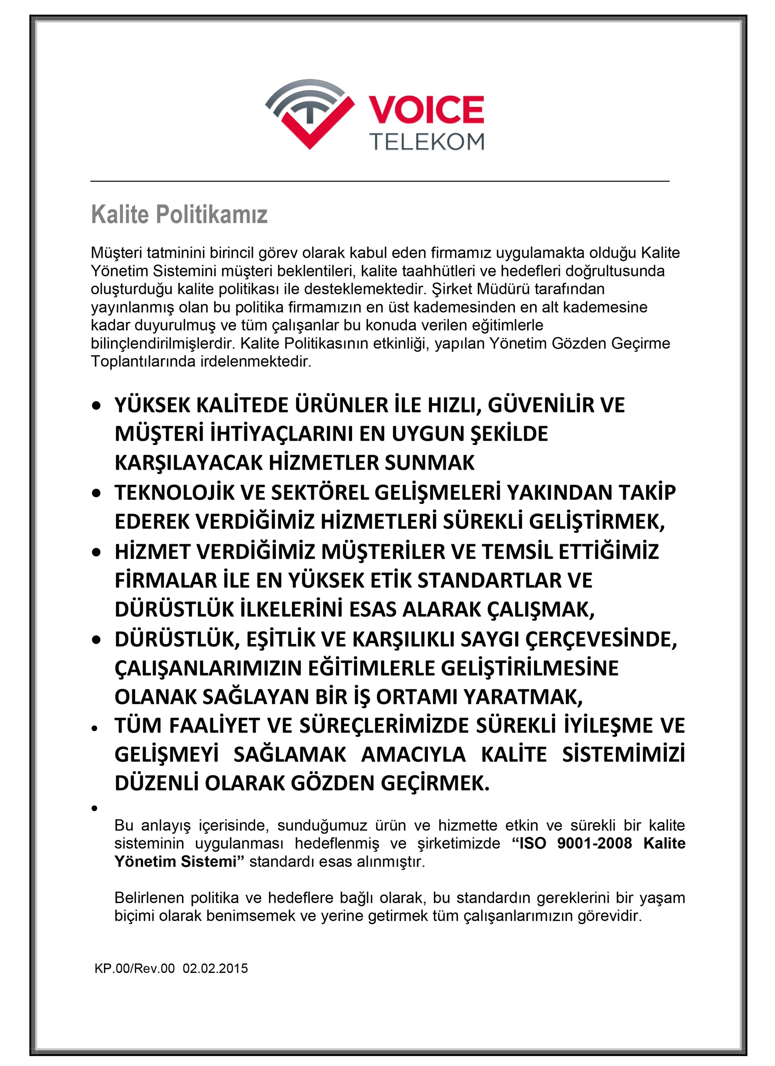 Voice Telekom Hizmetleri A.Ş ye Sistem Eğitim ve Belgelendirme Ltd. Şti. tarafından SABİT TELEFON HİZMETLERİ Kapsamında belgemiz